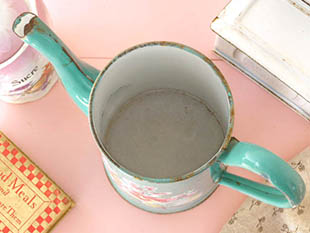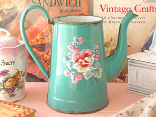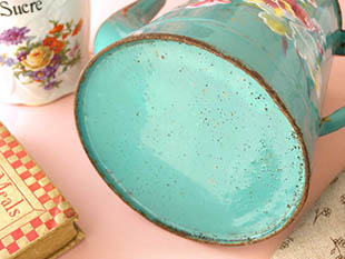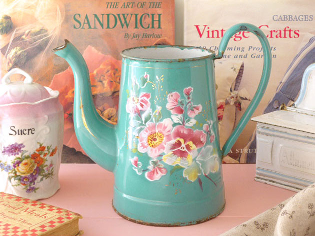 おそらくフランスで1930年代に製造されたホウロウ製のテュルコワーズロゼローズ&パンセカフェティエー