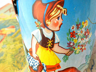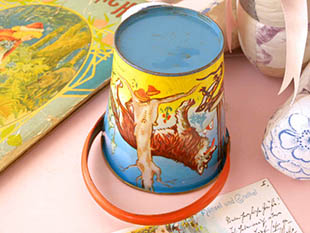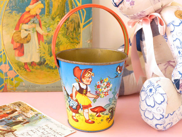 イク(おもちゃ)のバケッツ(バケツ)で、本体にはブロンドのヘアにロートのずきんをかぶってエプロンドレス