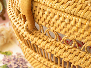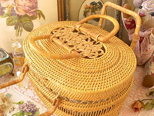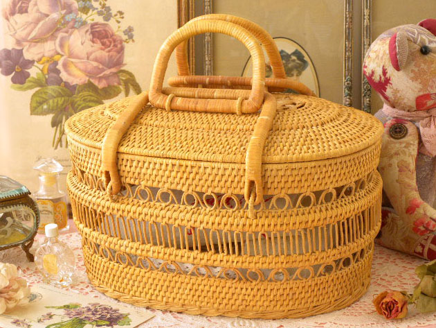 シュ(ファブリック)のアンサンブル(セット)で、細いロタンでていねいに編み込まれた本体の側面にはリング