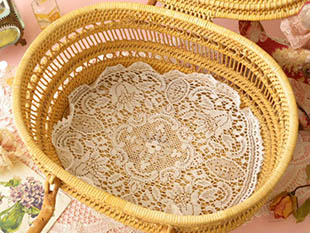 タンの編み込み)で制作されたパニエ(バスケット)とプーペ(ドール)用のドンテル(レース)と刺繍されたティッ