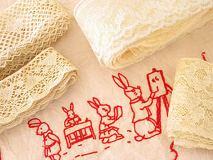 6.イヴォアールに ルージュの刺繍糸でアウトラインステッチやチェーンステッチなどで手刺繍がされたコッ