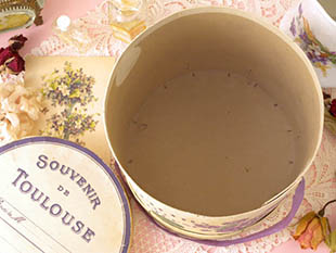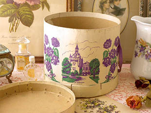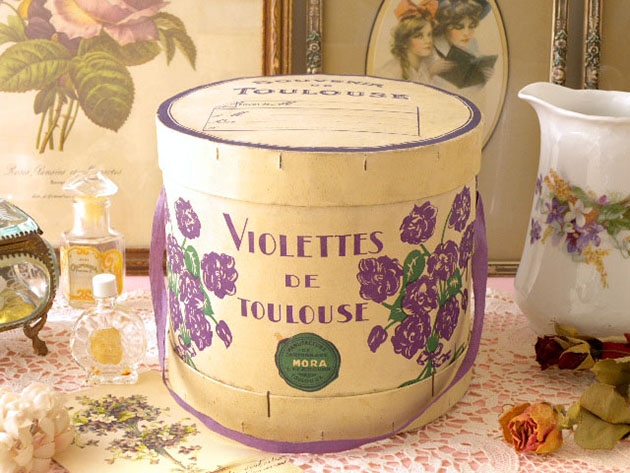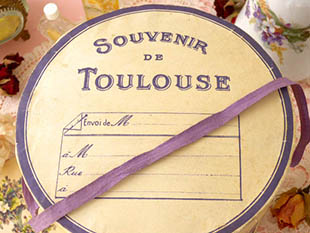 に制作されたカルトン製のすみれ色のリボンが付いた筒型のボワットで、フタにはSouvenir de Toulouse
