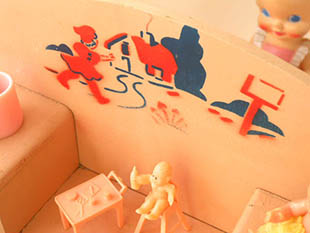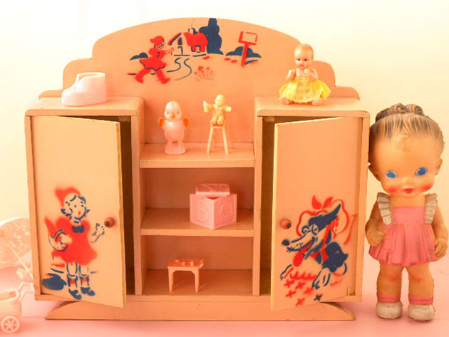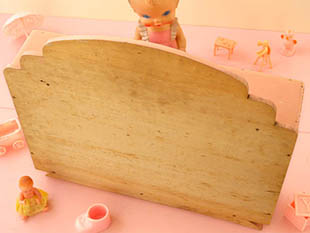イラストがデザインされたサーモンロゼ(サーモンピンク)のプーペ(ドール)用のエタジェール(飾り棚)で、両