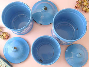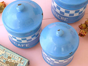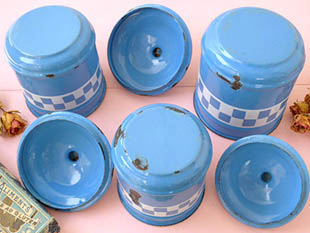 おそらく1930年代にフランスで製造されたホウロウ製のブルー&ブランシュダミエキュイズィーヌポ3アンサ