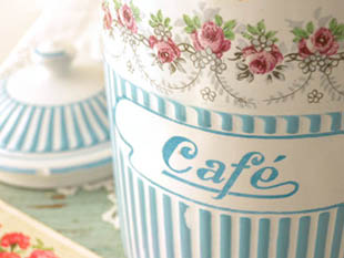 シュ(ホワイト)地にブルーのエンボスストライプの柄にブルーのCafeのロゴと可愛いロゼのローズのギルロ