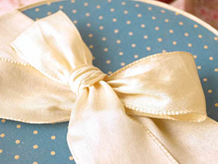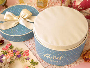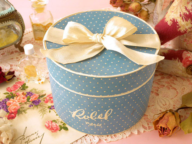 (水玉)模様のボワット(ボックス)で、フタには幅広のクレーム(クリーム)色のリュバン(リボン)が結ばれて本体