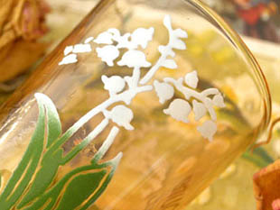 透明ガラスのカラフェやヴェールは琥珀色のリキュールを注がないとブランシュのミュゲが浮き上がりませ