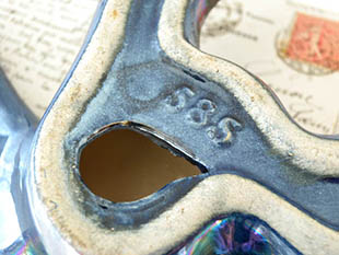 おそらく1950年代にフランスで製造された陶器製のイロンデールパラン&アンファンファイアンスデコールです。Faience(ファイアンス焼き)の名前で有名な錫釉(すずゆう)のポリコーム(色絵)陶器のデコール(装飾品)は、15世紀末から16世紀半ば頃にイタリアで製造されて有名なマジョリカ陶器の技法がフランスに渡ってバルボティーヌ陶器と同様にファイアンス陶器として製造されたようです。また、「ファイアンス」の名前はイタリアのロマーニャ地方にある「ファエンツァ」のフランス語名のようです。こちらはイヴォアール(アイボリー)にブルーフォンセ(ダークブルー)で彩色されたイロンデール(ツバメ)のパラン&アンファン(親と子)の壁掛け用のデコールで、いっしょに翼を広げて大空を楽しそうに飛んでいる姿が微笑ましくて可愛くてとてもいい感じです。また、イロンデールの羽の部分はナクレ(真珠の光沢)の彩色がされているので光があたると真珠のように輝いてとてもきれいです。お腹と羽の部分にはパパパランには585、ママパランには589、アンファンには590のエンボスがありますが、お腹には壁にかけるフック穴があるのも嬉しいですね。フランスではイロンデールは昔からミュゲ(ズズラン)と同様に幸せを運んでくる鳥と言われていますが、親子で三羽もいるので三倍の沢山の幸せを運んで来てくれそうで嬉しいすね。このまま壁に飾っても素敵ですが、工夫次第で色々と楽しく幸せに飾れそうなオシャレで可愛いイロンデールパラン&アンファンファイアンスデコールです。