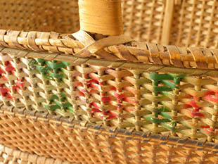 (バスケット)で、丁寧に編まれた取っ手の付いた本体の側面にはゴールドのトリムとボーダー柄のルージュの