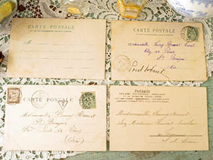 ンジー)のお花がデザインされています。また、切手に1903年の消印があるカルテポスタルには椅子に座って
