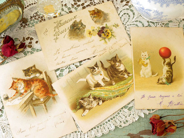 おそらく1900年代にフランスで製造された厚紙製のシャカルテポスタル4アンサンブルです。こちらは可愛