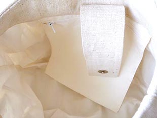 かりと縫製されています。また、内側はリネンと生成りのコトンが使われていて便利なファスナー付きのポ