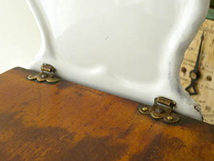 写真のようにフタの右側のヒンジの留め金の外れがおそらく1930年頃に職人の手で同じ真鍮の二本の釘で完