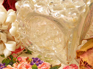 斜め格子のようなゴージャスなレリーフの本体に貼られた楕円形のマントヴェール(ミントグリーン)の縁取り
