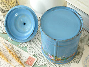 美しいブルーのキュイズィーヌ(キッチン)用のポ(ポット)で、フタと本体にはロゼのローズとポープル(パー