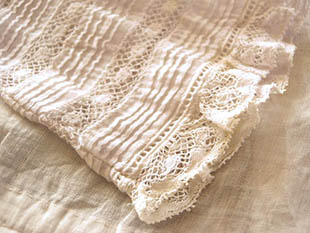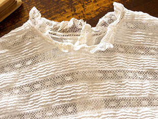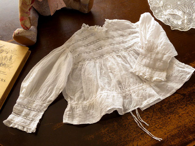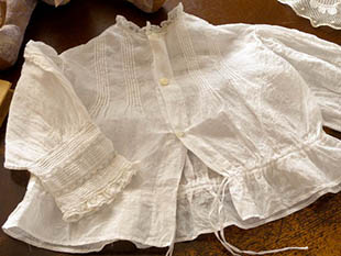 ベベ(ベビー)用のシュミズィエ(ブラウス)で、襟や胸元や袖口には細かいピンタックやポワ(ドット)柄のダン