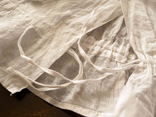 ピンタックが入っているのもオシャレですね。背中は三つのブトンコキーユ(シェルボタン)で留められてウエ