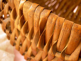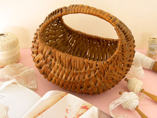 エ(ラタンの編み込み)で製造されたクチュール(ソーイング)用のパニエ(バスケット)で、飴色になったロタン