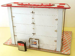 正面には上部が透明なプラスチック製のガードのある白いディスプレー台があります。三段の棚には豆電球