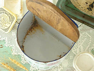 も木製のフタが残っているものは入手はとても困難なってきたようです。壁に掛けてキッチンの小物入れや
