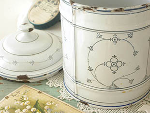 フランスでおそらく1920年代に製造されたホウロウ製のインディアンブルー&ブランシュサックスシュクレ