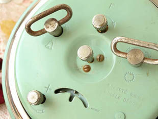 るノブはアラームの設定用でダイヤル上部の小さな針で時間を設定します。また、本体の上部にはアラーム