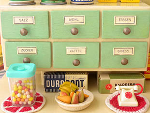 で、本体の左上にはメタル製の取っ手とラベルが貼られたグリューンの引き出しが六つ付いていて左上から