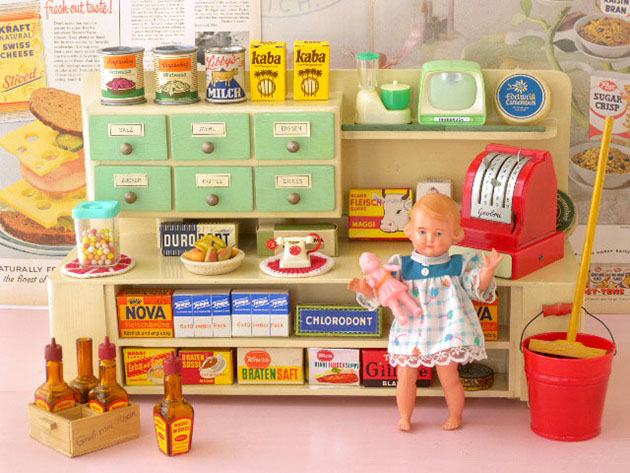 リーン)に塗装されたプッペン用のレーベンスミッテルゲシャフト(食料品店)のリガール(棚)のセッツ(セット)