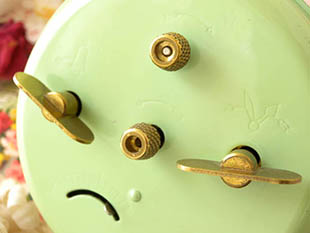 製のアラームストップボタンが付いています。また、下部には時計の速度調整レバーがありますが、ドライ