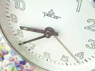 ルバー色がオシャレでとてもいい感じです。また、ダイヤルの下部にはPeter Designと書かれていて時針と