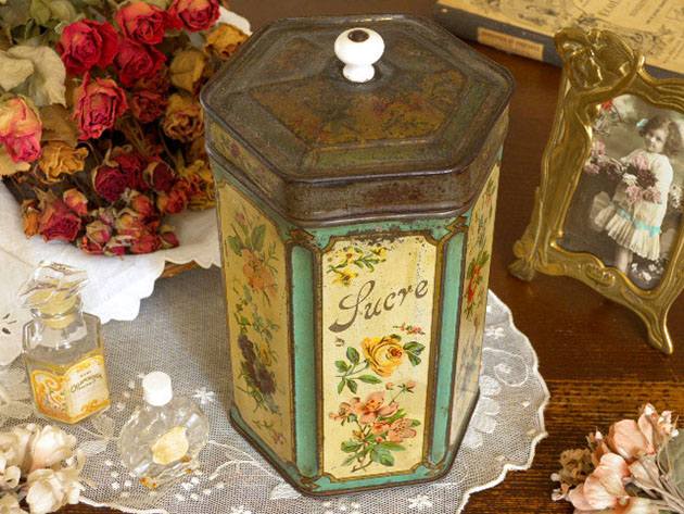 閉できるスィスコティ(六角形)のフタに白いポーセレン(磁器)の取っ手の付いたシュクレ(シュガー)を入れる