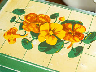 プードル/チョコレートパウダー)のロゴとオランジュ(オレンジ)とジョーヌ(イエロー)のナスタチウムの花が