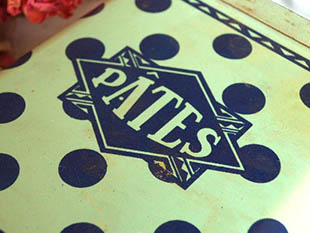 の飾り罫のクロス模様の上にデザインされたディアマン(菱形)の中にフッシュアイで見たようなロゴでPates