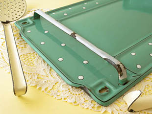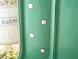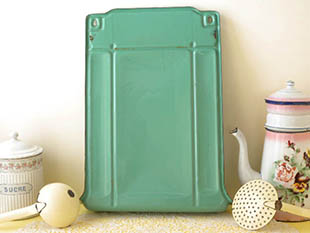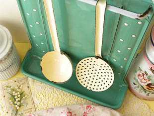 ベルギーでおそらく1920年代に製造されたホウロウ製のルッシュとエキュモワール付きのブルーヴェール&ブランシュポワポルトユストンシーレです。ポルトユストンシーレ(レードルラック)はルッシュ(レードル/おたま)やエキュモワール(スキマー)などの調理器具を掛ける壁掛けタイプのラックのことで、19世紀の半ば頃からホウロウ製のものが製造されたようですがオランダ、フランス、ベルギーなどで人気があったようです。こちらは大変レアなイヴォワール(アイボリー)のルッシュとエキュモワールが付属したポルトユストンシーレで、ブルーヴェール(ブルーグリーン)の本体の周りにはブランシュ(ホワイト)のポワ(ポルカドット)模様がデザインされていてエレガントでオシャレでとてもいい感じです。また、ブランシュのポワはホウロウを盛り上げたようなレリーフで立体感がありとても凝った作りです。また、上部には壁掛け用の2個のフック穴とルッシュなどを掛けるブランシュのバーがありルッシュから落ちる水滴は下部の受け皿が受け止めてくれます。マークなどの表示がないのでプロダクトメーカーについては良く分かりませんが作りがいいのでベルギーの小さな工房などで製造されたようです。バーにレースなどを掛けて受け皿に小物を入れて飾ったりしてもオシャレでフランスカルチャーのゆったりとした時の流れを感じさせてくれそうですね。ポワ模様とブルーヴェールカラーの製品はベルギーやフランスでもとても人気が高いですが、当時の美しい輝きが今も残っているとてもオシャレな一品です。