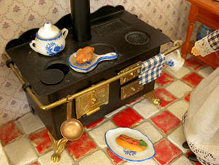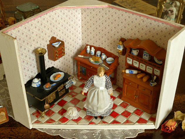 ワイトに塗装されたプッペンキュッヒェ(おもちゃの台所)で、プッペンキュッヒェの床は本物のレッドブラウ
