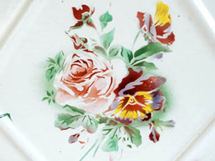 皿が受け止めてくれます。本体にはジオメトリックパターンのエンボスの中に可憐なロゼローズとジョーヌ