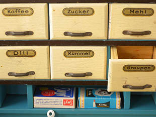 (コーヒー)、Mehl(小麦粉)、Zucker(シュガー)、Kummel(スパイス)、Dill(カレー粉)、Graupen(大麦)と書かれ