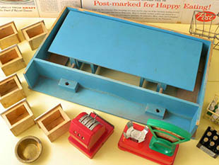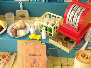 おそらく1940年代にドイツで製造されたホルツ(ウッド)製の小物付きのプッペンレーベンスミッテルゲシャフ