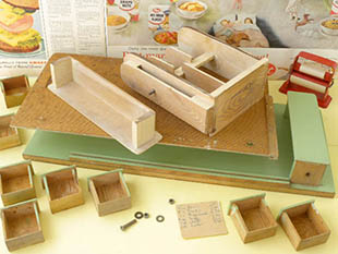 おそらく1940年代にドイツで製造されたホルツ(ウッド)製の小物付きのプッペンレーベンスミッテルゲシャ