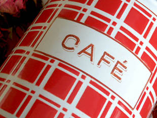 少し茶色がかったルージュのブレイド(格子)柄にCafeのロゴがデザインされていてエレガントでオシャレで