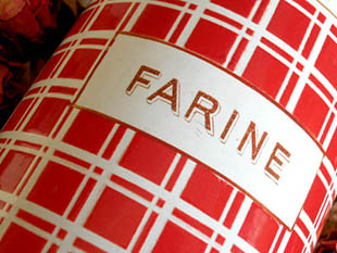なフタ付きのFarine(ファリーヌ/小麦粉)を入れるためのポ(ポット)で、爽やかなブランシュ(ホワイト)地に少