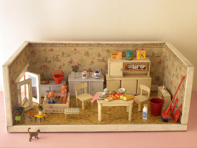 ドイツでおそらく1930年代に木材とガラスと紙とブリキと陶器とプラスチックで製作されたプッペと小物付