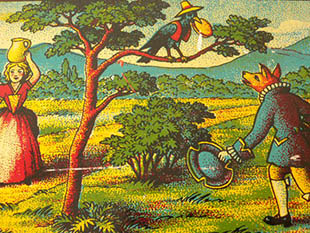 上の美味しそうな肉をくわえたカラスが美しい鳴き声が聞きたいとキツネにおだてられて思わず鳴いた瞬間
