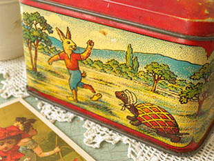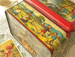 ヒンジで開閉するフタの付いたビスキュイボワット(ボックス)で、ルージュのボワットには六つの お話のイ