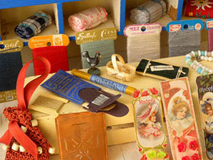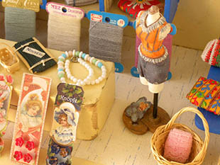 スプールに巻かれたカラフルなカラーの毛糸のような糸が6個、左の棚にはシェルビーズの飾りが付いた茶色