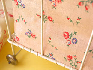 の布が取り付けられています。また、本体にはリネンの敷き布団とやはりローザに赤いバラの花模様の生地