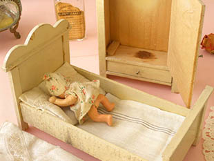 で作られてエルフェンバイン(アイボリー)に塗装されたプッペ(ドール)用のベッツ(ベッド)とクライダーシュ