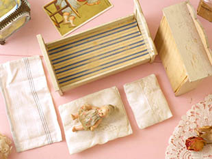 器)製のベビープッペが寝かされていてつぶらな瞳でママを見ているような表情が可愛くてとてもいい感じで
