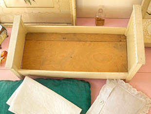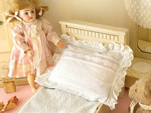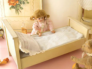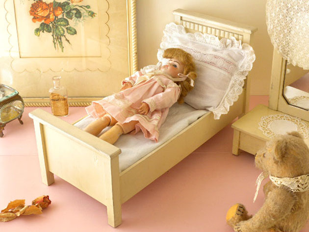 れてエルフェンバイン(アイボリー)に塗装されたプッペ用のベッツ(ベッド)で、ヘッドボードには横に短なス