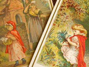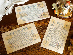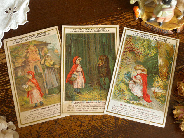 マルセイユのサン・フェレオル通り58番地にあるAu Nouveau Paris(オ・ヌーヴォー・パリ)というランジュリ(ランジェリー)の専門店がおそらく1900年代に販売促進用に制作したル・プティシャペロンルージュ・クロモ3アンサンブルです。こちらは超レアなLe Petit Chaperon Rouge(ル・プティシャペロンルージュ/赤ずきんちゃん)の楽しいお話とイラストがデザインされたクロモ(トレーディングカード)のNo.2、No.3、No.4の3枚のアンサンブル(セット)で、クロモの表面の上部にはAu Nouveau Paris(オ・ヌーヴォー・パリ) 58, Rue St-ferreol- Marseille(マルセイユのサン・フェレオル通り58番地)の表示があります。また、森の家に住んでいる病気のおばあさんにパニエに入ったガレット(ライ麦パン)とポ(ポット)を届けにいくル・プティシャペロンルージュと心配そうに見送っているお母さんのイラストがデザインされていてオシャレで可愛くてとてもいい感じです。また、シャペロンルージュの家の様子が細部まで丁寧に描かれていていクオリティーが高いですね。また、イラストは全て特色インクを使った高価な石版印刷で刷られているのでイラストの発色が良くとてもきれいです。また、下部にはLe Petit Chaperon Rouge (2) La maman accompagna le Petit Chaperon Rouge jusqu'a la porte du jardin, Iui recommanda de ne pas s'amuser en route, car il fatlait traverser un bois pour aller au village voisin ou demeurait la grand'mere. Elle la suivit longtemps des yeux.(お母さんは赤ずきんちゃんに庭の門の扉に連れて行き、おばあさんの住んでいる隣村には森を通っていくので途中で道草しないように言いました。そして、お母さんは長い間赤ずきんちゃんの後ろ姿を見つめていました・・・)というようなお話が書かれているのも楽しいですね。また、裏面にはAu Nouveau Paris, 58, Rue St-ferreol- Marseille(マルセイユのサン・フェレオル通り58番地) La Plus Importante Fabrique de Lingerie du Midi(ミディ通りで最も重要なランジェリー工場) Linge de Maison(家庭用リネン)などの表示があります。古いクロモの価値はどんどん高くなりイラストのクオリティーが高いクロモはコレクターズアイテムとなっているようです。フランスで1900年代に製作された素晴らしいデザインのプティシャペロンルージュの表情がとても可愛い超レアな価値ある一品です。